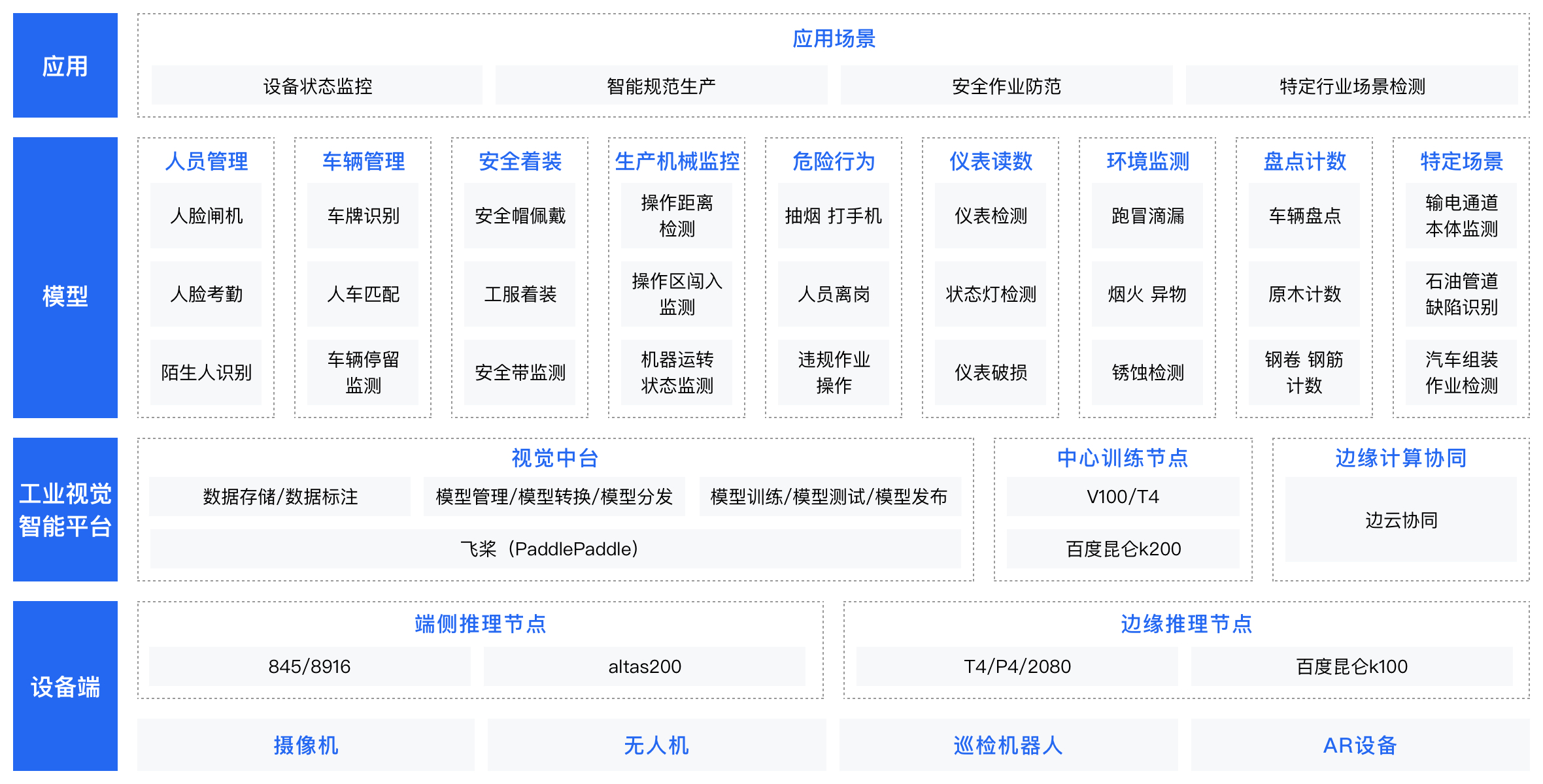 基于百度多年的视觉技术的积累,集成各类摄像头、无人机、机器人、AI芯片及巡检场景模型,实现对工业生产领域生产作业、设备状态、人员安全的智能监控和实时预警,助力企业实现安全生产,提升监管效率